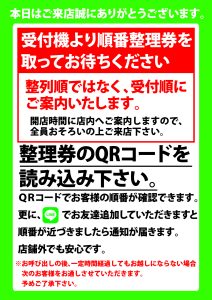 - 開店3分前になりましたら、整理券番号順にお集まりいただき、スタッフの案内に沿ってご入店ください。